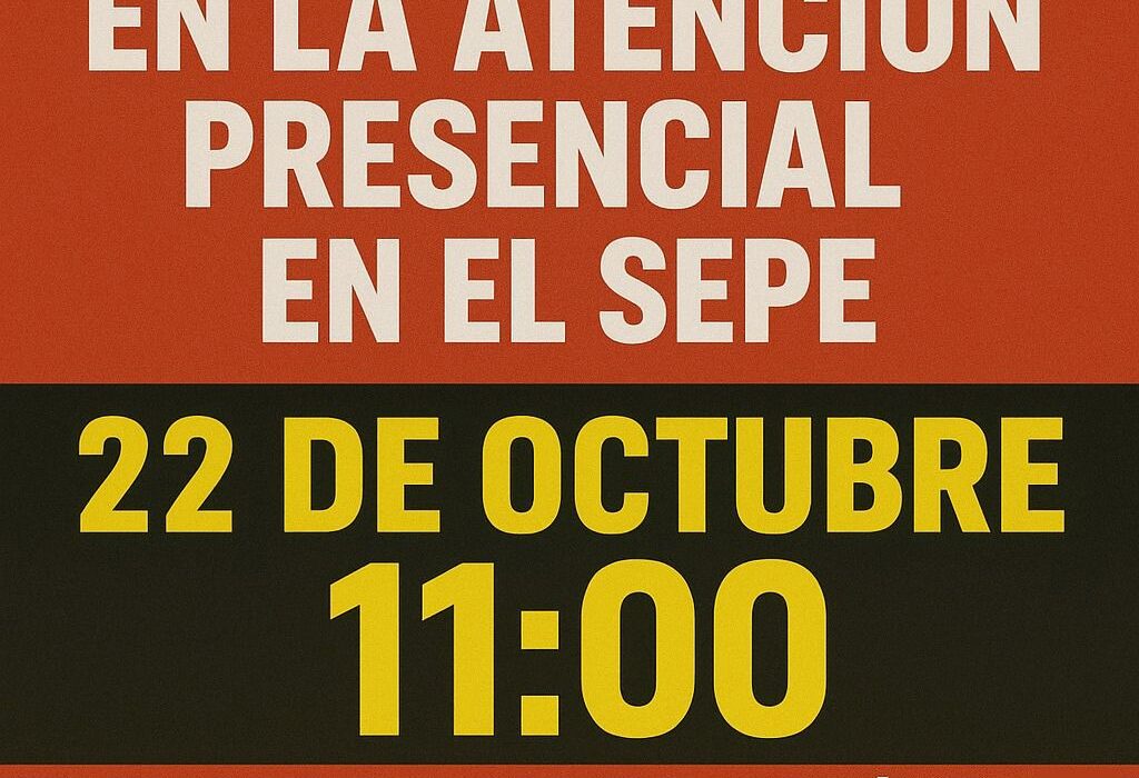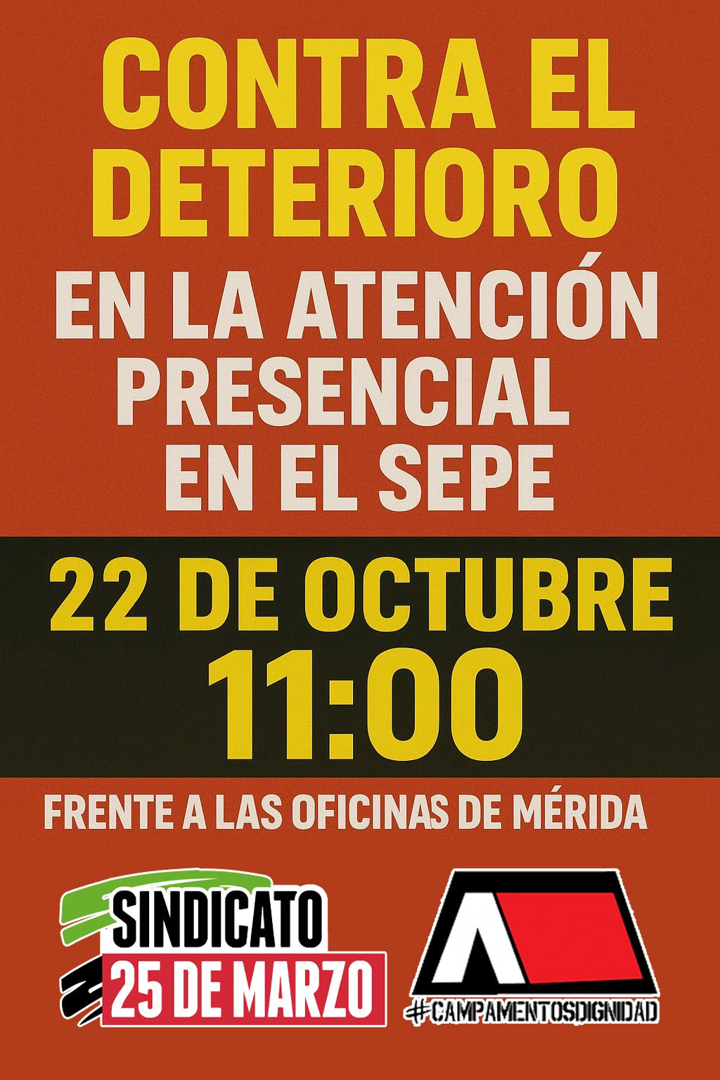 El Sindicato 25 de Marzo con el Campamento Dignidad Extremadura convocamos frente al SEPE de Mérida este miércoles 22 de octubre a las 11:00 para denunciar el deterior en la atención presencial en las oficinas del SEPE.